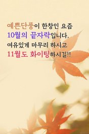 ¿À»ö ´ÜdzÀ¸·Î °ö°Ô ¹°µé¾î°¡´Â 10¿ùÀÇ ¸¶Áö¸· ¸ñ¿äÀÏÀÔ´Ï´Ù~ ±×µ¿¾È º£Ç®¾îÁֽеû¶æÇÑ ¸¶À½¿¡ °¨»çµå¸®¸ç, ¾ËÂù °á½Ç ¸Î´Â dz¿ä·Î¿î 11¿ù ¸ÂÀÌÇϽñ⠹ٶø´Ï´Ù.